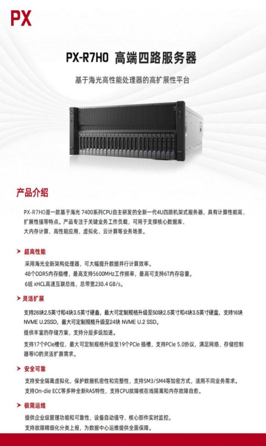 基于海光高性能处理器的高扩展性平台,可用于支撑核心数据库、大内存计算、高性能应用、虚拟化、云计算等业务场景。